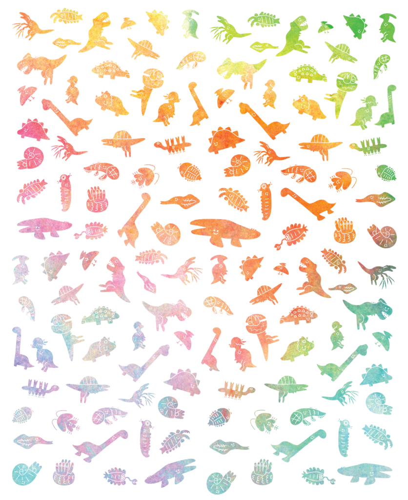 現在自身で描いている全ての古生物を集合させて隙間を埋めるようなデザインにしました。作成したイラストで各商品展開しました。イラストなどで隙間を埋めるのが得意です。